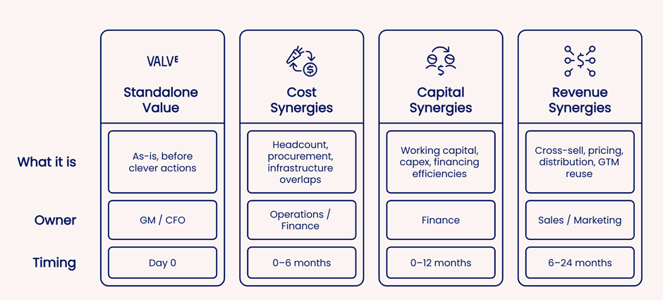 Every synergy in the model should be traceable to a real operational action and a real owner.